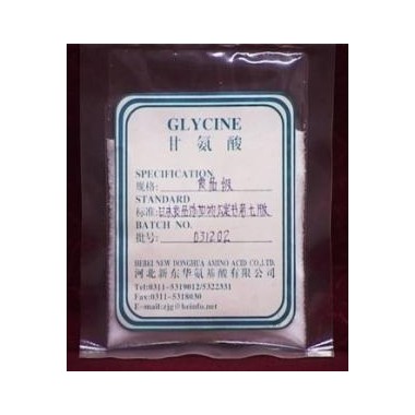 规格:食品级[分子式]:C2H5NO2 [分子量]:75.07 [结构式]:NH2CH2COOH [物化性质]:白色结晶性粉末,有甜味,易溶于水,微溶于甲醇、乙醇,不溶于、。熔点232-236℃(分解)。 [质量标准]: 食品级符合美国食用化学法典第四版 ; 日本食品添加物公定书第七版标准HG/T3883-2006标准项目指标 氨基乙酸含量 ( 以干基计 ) %98.5-101.5 氯化物( 以Cl计 )% ≤0.010 *(以Pb计) % ≤ 0.002 砷(As)% ≤0.0001 铅(Pb) % ≤0.0005 干燥减量 % ≤0.20 灼烧残渣% ≤0.10 澄清度试验合格 PH 值(50g/L水溶液)5.5-7.0 FCCIV 标准 项目指标 甘氨酸含量(以干基计) %98.5-101.5 干燥减量% ≤0.20 *(以铅计)% ≤0.0020 灼烧残渣% ≤0.10 铅(Pb)含量% ≤0.0005 外观白色结晶 日本食品添加物公定书第七版标准 项目指标 甘氨酸含量(以干基计) %98.5-101.5 氯化物% ≤0.021 干燥减量% ≤0.30 *(以铅计)% ≤0.0020 灼烧残渣% ≤0.10 砷(以AS2O3计)% ≤0.00040PH值(50g/L水溶液)5.5-7.0 澄清度澄明 外观白色结晶 食品级甘氨酸用途:(1)用做调味剂、甜味剂,与DL-丙氨酸、枸橼酸等配合使用于含醇饮料中;合成清酒和精良饮料时用作酸味矫正剂,在腌制咸菜、甜酱、酱油、醋和果汁时用做添加剂,以改善食品风味、保持原味、提供甜味源等。(2)用作鱼糜制品、花生酱等的防腐剂。(3)利用它本身的氨基和羧基,对食盐和醋等味感起缓冲作用。 (4)食品酿造、肉食加工和清凉饮料的配方及糖精钠的去苦剂。(5)用作奶油、干酪、人工造奶、速食面、小麦粉和猪油等的稳定剂。(6)用作食品加工中对维生素C进行稳定。(7)在味精中有10%的成份为甘氨酸。(8)可用作防腐剂,起到重要的防腐作用。